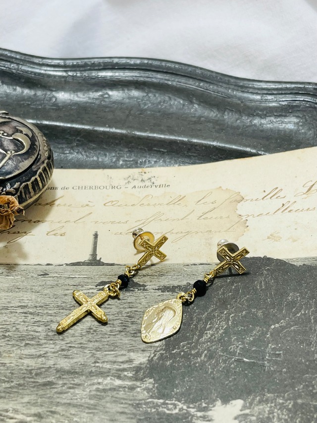 Garden of Eden とコラボで製作した 弊社オリジナルの定番ピアスです。 どんなスタイルにも合わせやすいデザインで長年に渡り人気です。 クロスとマリアがセットで一組になります。(お間違え有りませんように) カラー展開 a. silver925 X stone(shell) b. brass gold coating X stone (black spinel / 針のみgold10k) quality : silver925/brass size トップ クロス 幅1.1cm X 高さ1.8cm トップ マリア 幅1cm X 高さ1.5cm *イアリングは客注で製作可能です。 期間に関しましてはその都度違います. (製作期間はおおよそ、2週間~4週間頂きます) ご注文後に期間をお知らせ致します お気軽にご相談くださいませ。