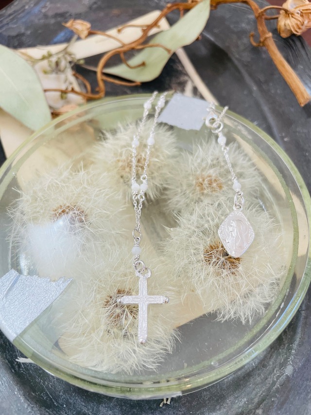 Garden of Eden とコラボで製作した 弊社オリジナルの定番のネックレスです。 どんなスタイルにも合わせやすいデザインで長年に渡り人気です。 size ストラップ長さ 45cmもしくは47cm(アジャスターで2通りに調節できます) トップ クロス 幅1.1cm X 高さ1.8cm トップ マリア 幅1cm X 高さ1.5cm a. silver925 X stone(shell) b. silver925 gold coating X stone (black spinel / topのみbrass)